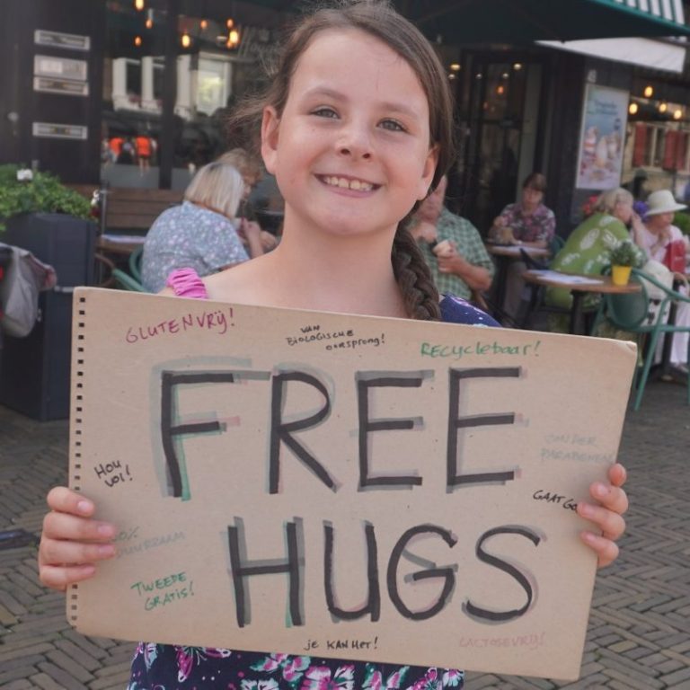 Pak een grote kartonnen plaat, en schrijf er op "free hugs". Voeg er versiering aan toe, of zoals ik dat heb gedaan, komische onzin zoals "tweede gratis" en "glutenvrij". Ga vervolgens glimlachend in een drukke winkelstraat staan en laat de knuffels maar komen. Geen geluk? Misschien moet je een andere plek vinden. Eerst voelt het gek, daarna voelt het geweldig. Mensen worden er blij van!