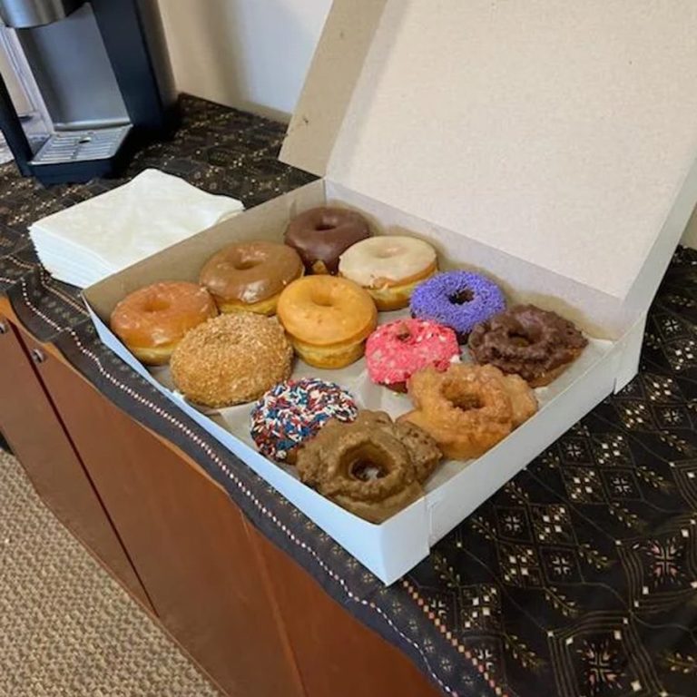 Zonder dat er een feest of verjaardag is: deel lekker donuts uit op je werk. Mensen zullen het zeer waarderen en eerlijk gezegd, jij zelf vast ook.